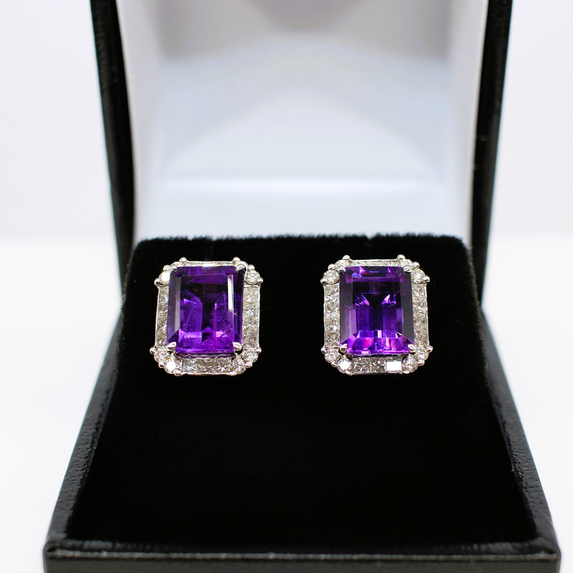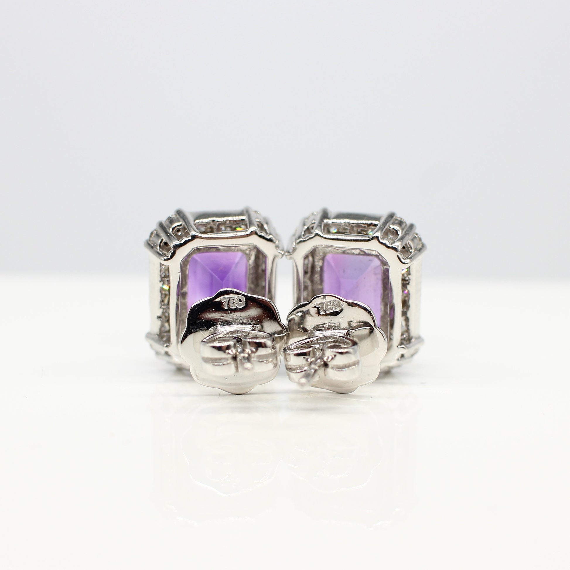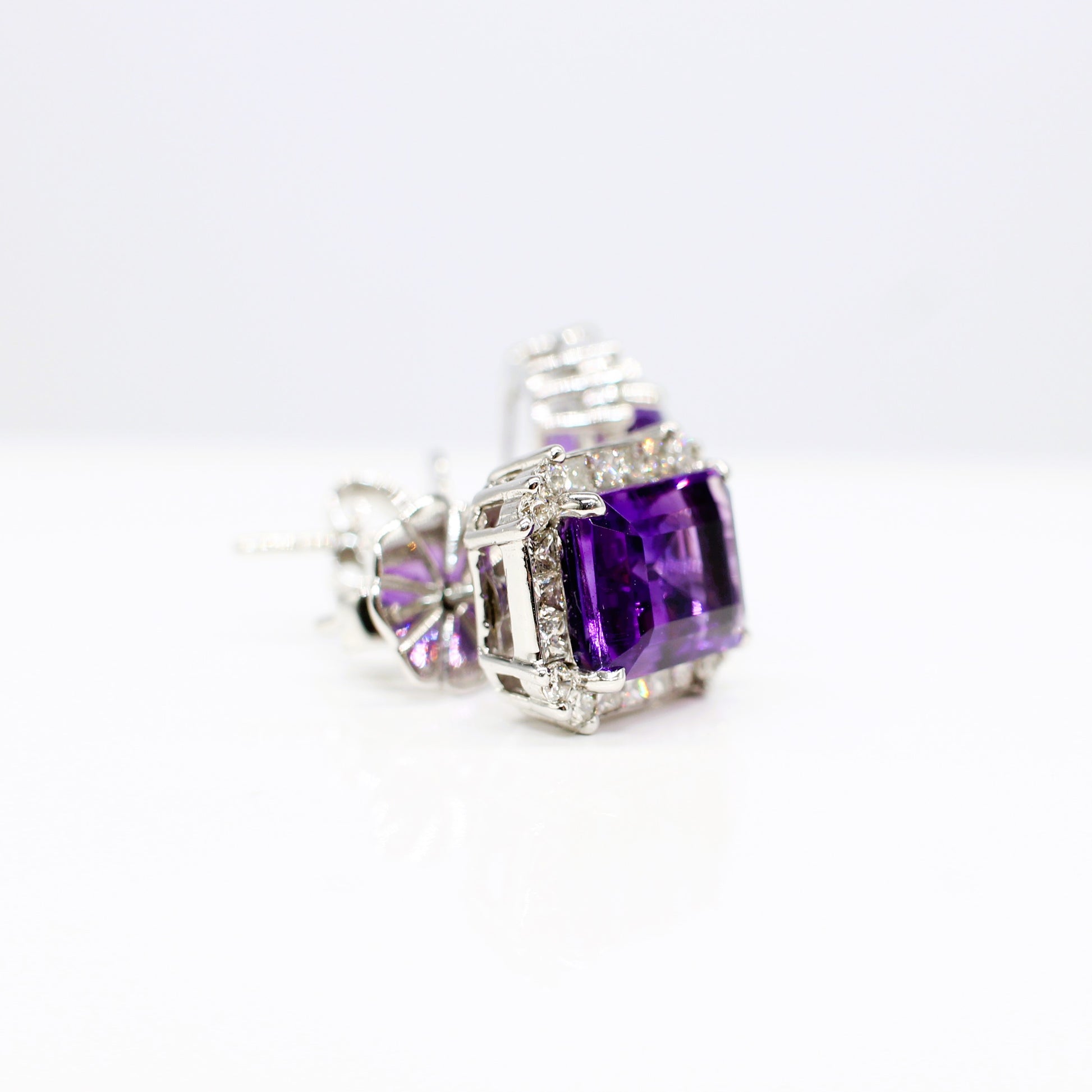 A Pair Of Amethyst And Diamond Halo Ear Studs In 18K White Gold. Sourced by Flawless Enigma.