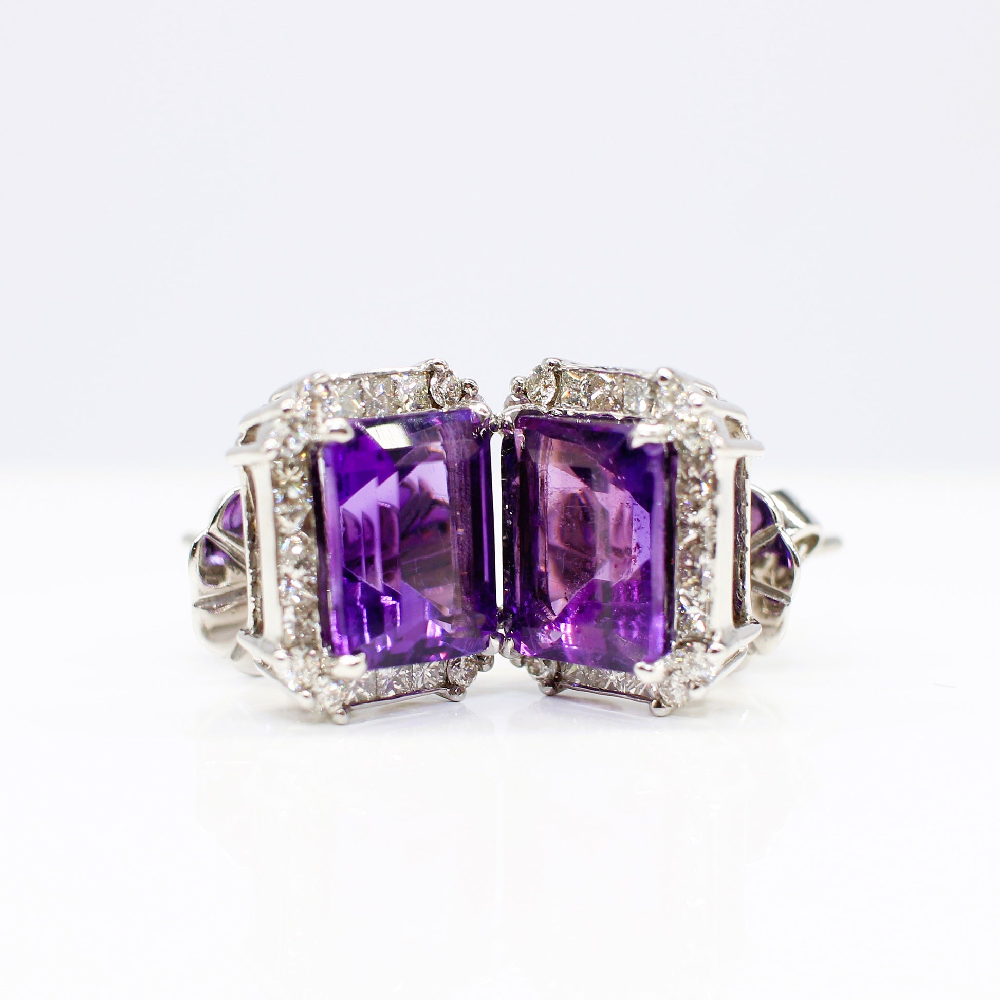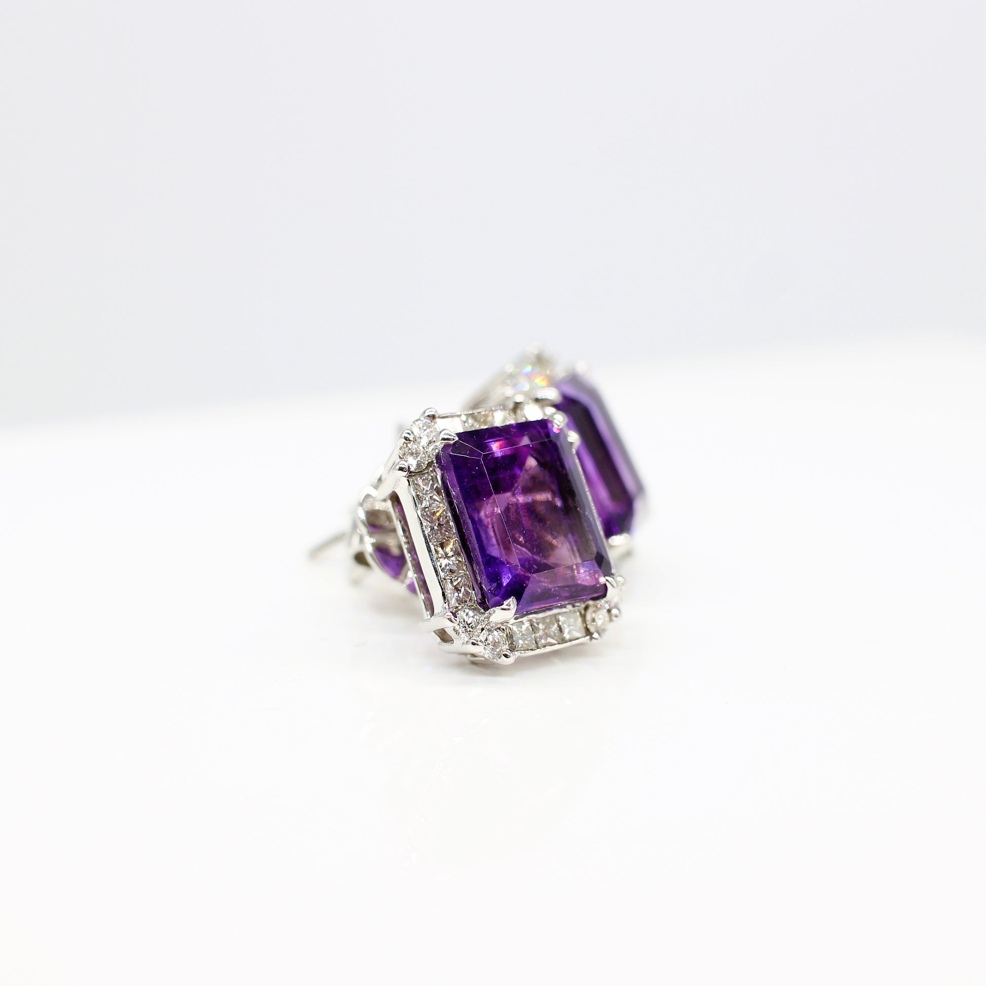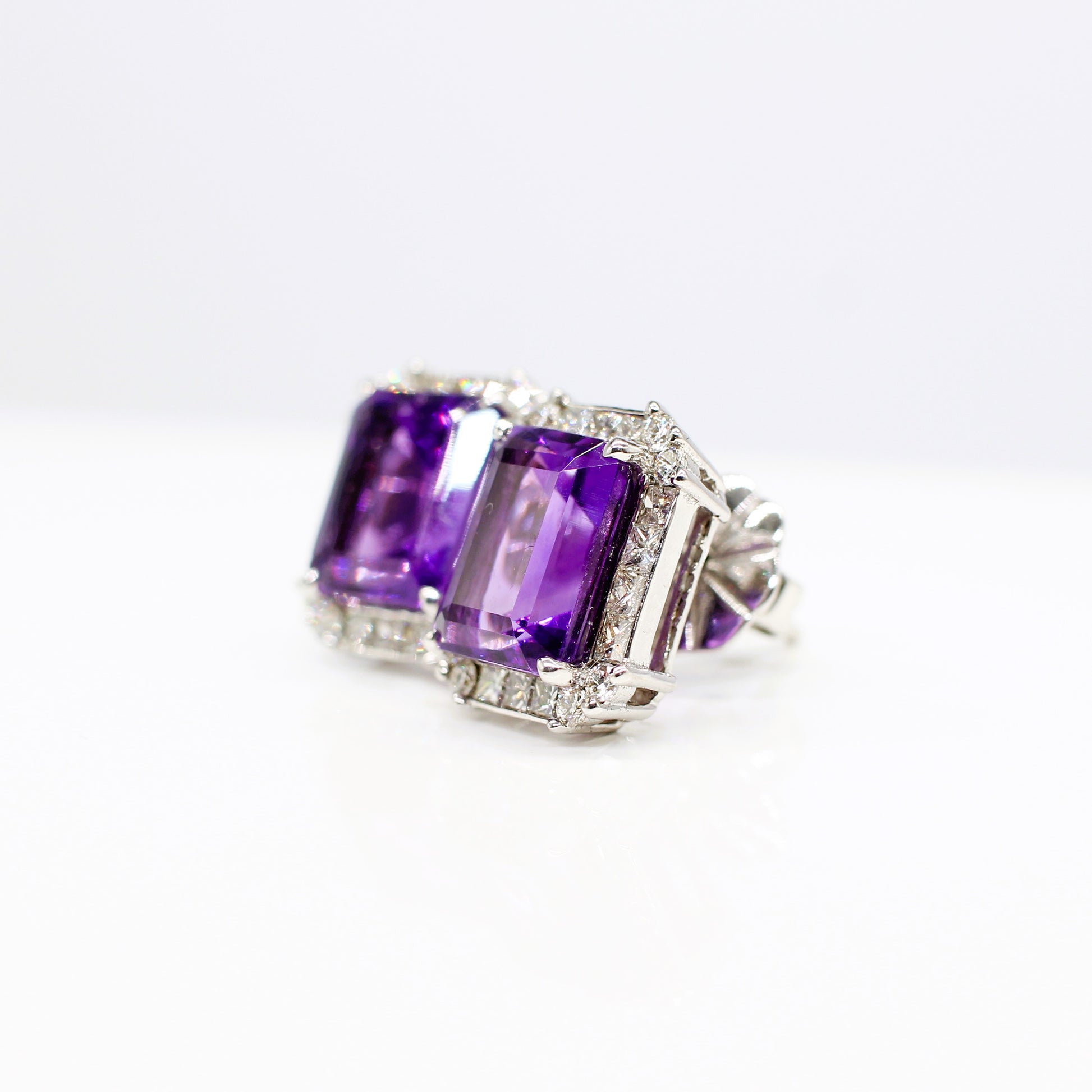 A Pair Of Amethyst And Diamond Halo Ear Studs In 18K White Gold. Sourced by Flawless Enigma.
