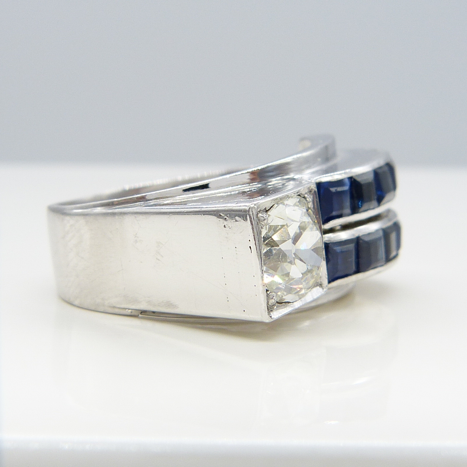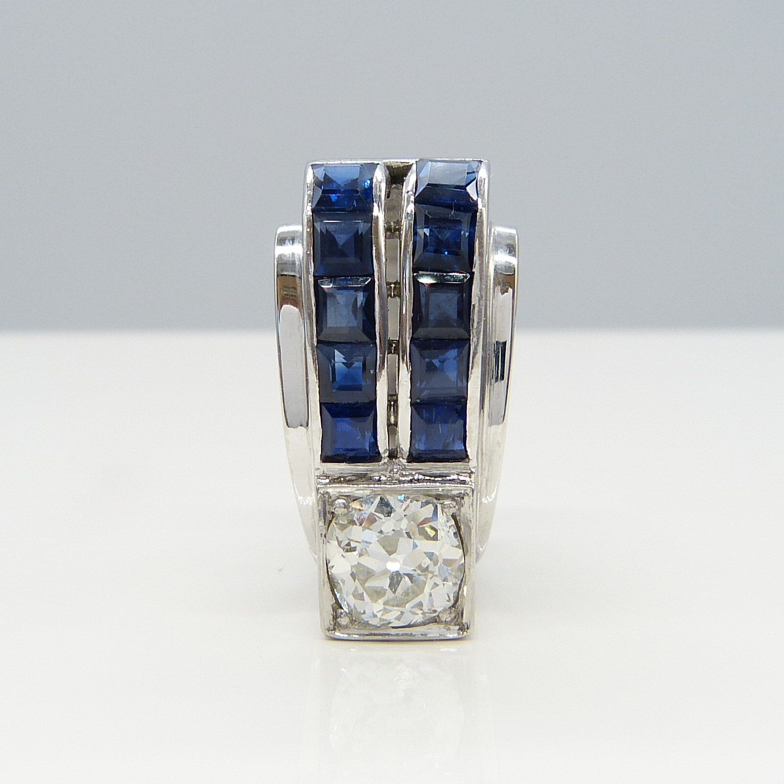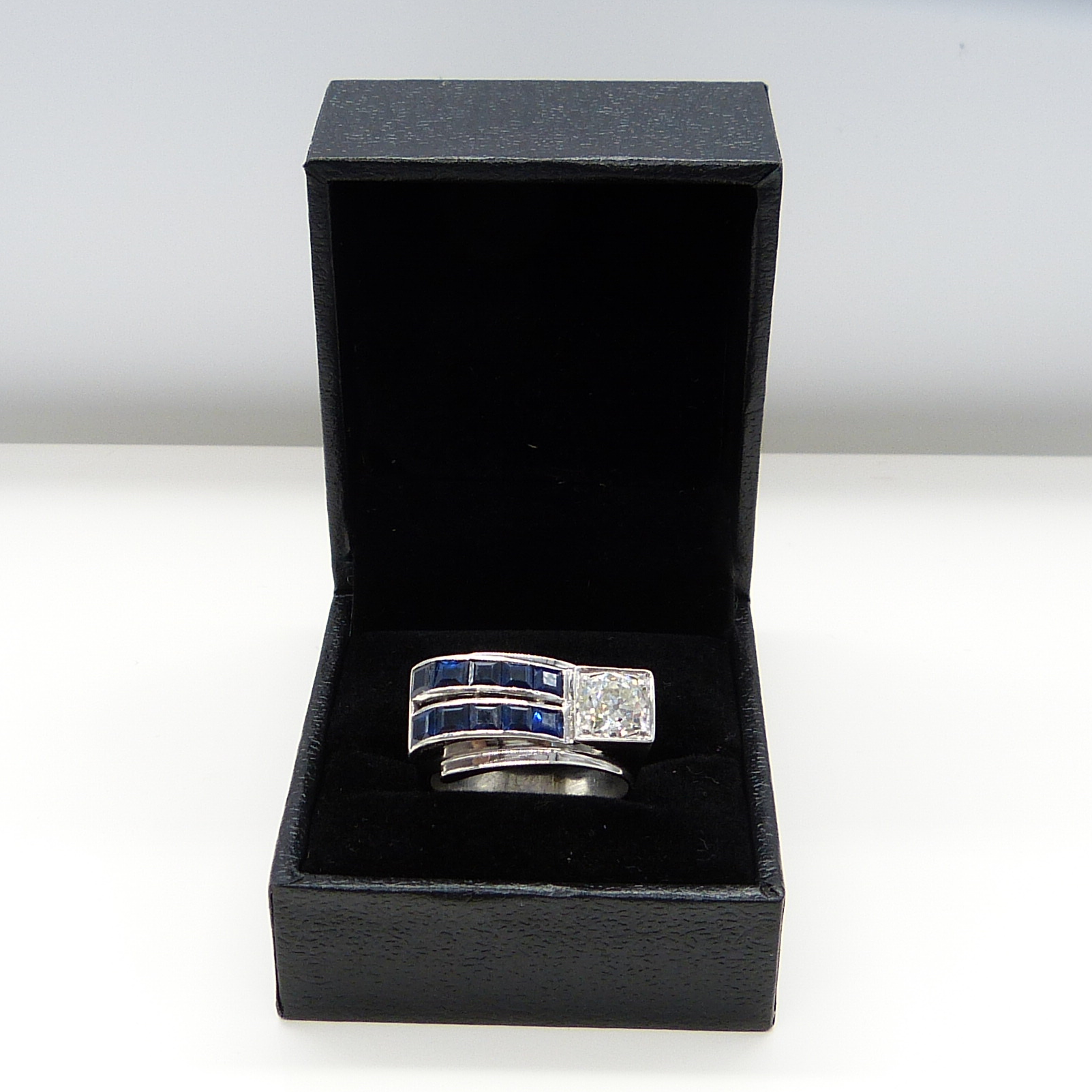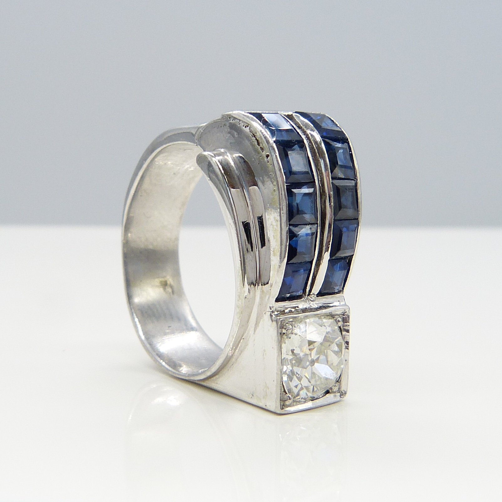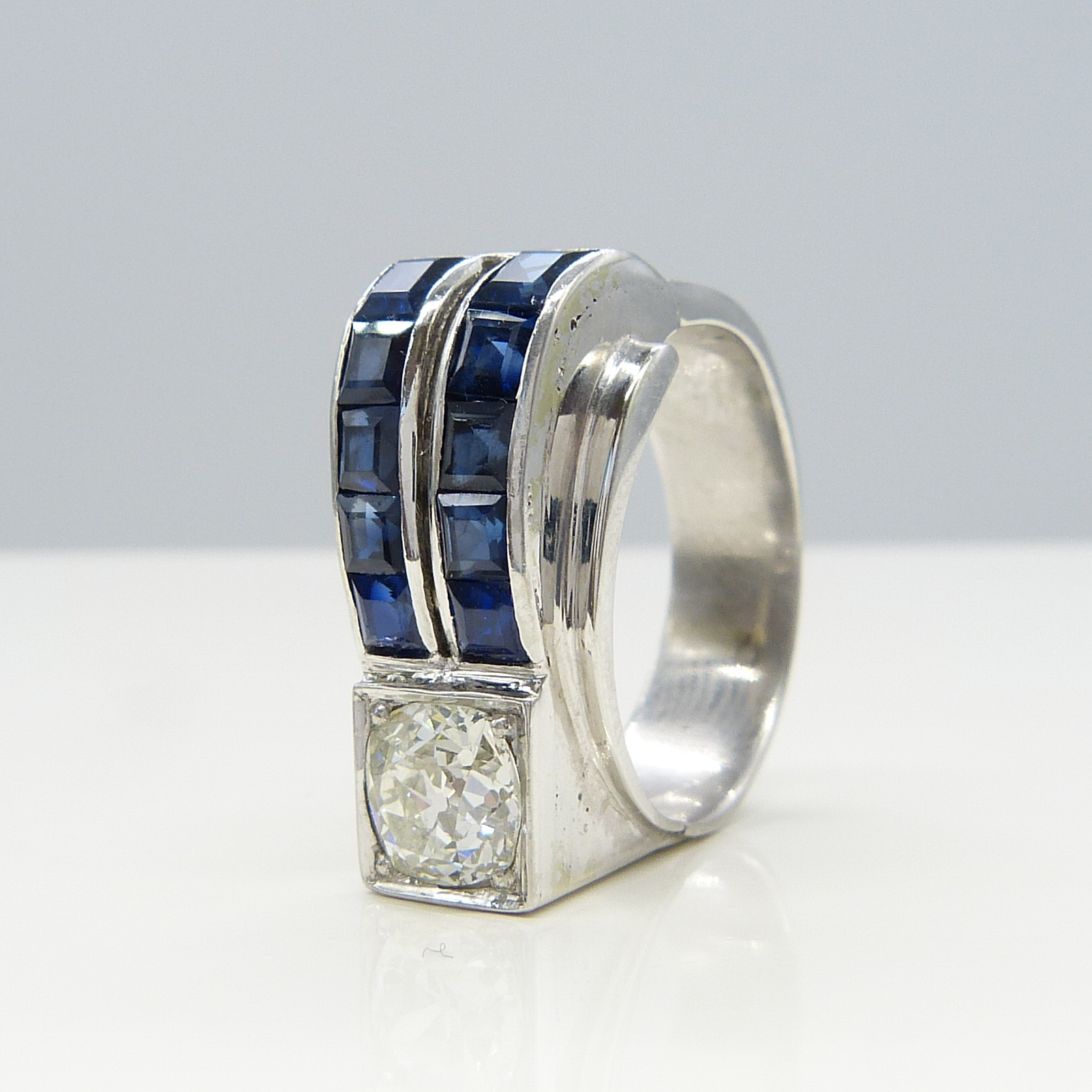 A beautiful pre-owned 18K white gold ring, in a retro-cocktail design. Set with blue square-cut sapphires weighing 1.50ct and a single old-mine-cut diamond weighing 1.15ct